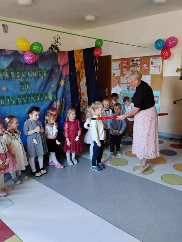 Najważniejszym momentem calej uroczystości był oczywiście akt pasowania. Pani Małgorzata Pietrzak dyrektor naszego przedszkola dotykała ramienia każdego dziecka kolorową kredką wypowiadając słowa " Pasuję cię na przedszkolaka". Od tej chwili nasze maluchy zostały oficjalnie przyjęte do grona przedszkolaków. Na zakończenie uroczystości dzieci otrzymały pamiątkowe dyplomy oraz upominki.