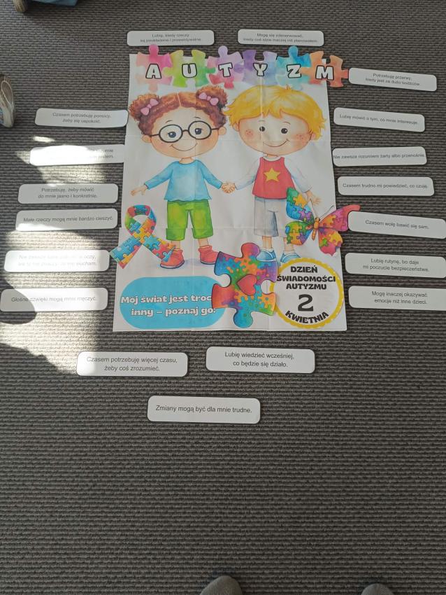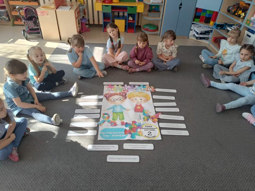 2 kwietnia przypada Światowy Dzień Świadomości Autyzmu. Jego celem jest propagowanie wiedzy na temat autyzmu. Przedszkolaki na znak solidarności z osobami w spektrum autyzmu dołączyły do akcji. W przedszkolu odbyły się zajęcia dotyczące autyzmu mające na celu budowanie wśród dzieci wrażliwości społecznej w tym zakresie. W trakcie zajęć zwrócono uwagę na potrzebę większej empatii i tolerancji dla odmiennych możliwości i potrzeb osób w spektrum autyzmu. Dzieci w temat autyzmu wprowadziła krótka bajka edukacyjna, która w prosty sposób wyjaśniła, jak funkcjonują osoby z autyzmem. Proste ćwiczenia sensoryczne pomogły dzieciom zrozumieć, w jaki sposób działają zmysły osób z autyzmem. Dzieci w trakcie zajęć poznały charakterystyczne cechy osób z autyzmem, dowiedziały się, z jakimi kłopotami mogą mierzyć się te osoby, jakie emocje odczuwają oraz jak być dobrym przyjacielem takiej osoby.