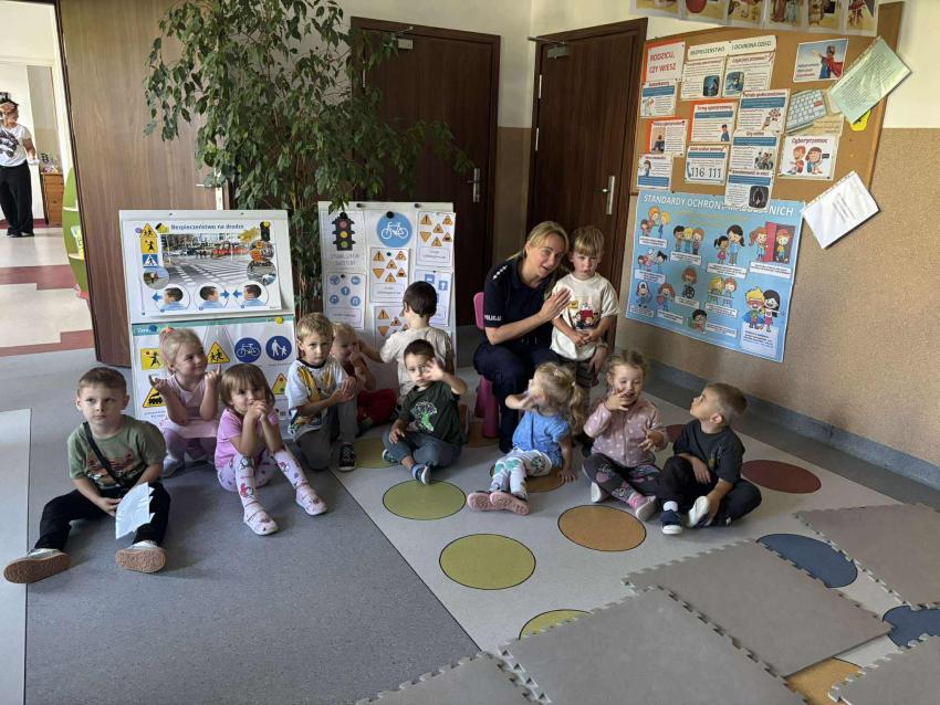 W naszym przedszkolu kładziemy duży nacisk na bezpieczeństwo oraz edukację związaną z bezpieczeństwem. Dlatego we wtorek 23.09.2025 naszych przedszkolaków odwiedziła Pani Policjantka z Komendy Powiatowej Policji w Gryficach pani Agnieszka Podgórska..